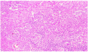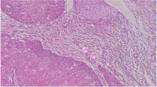 Histopathology of OSCC (Oral Squamous Cell Carcinoma) samples was done to grade them according to their differentiation. Histopathology was not only done to grade the tumor tissues but also used to get an idea about the prognosis or aggressiveness of disease. For histopathological grading of cases, 50-60 mg of OSCC (Oral Squamous Cell Carcinoma) tissue samples is obtained and put in formal saline. Parts were first embedded in paraffin wax; then tissue blocks were created and sliced into thin, uniformly cut sections using a microtome. The pieces were then placed on slides and stained with hematoxylin and eosin (fig. 1).