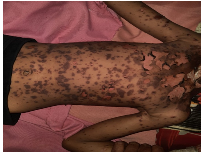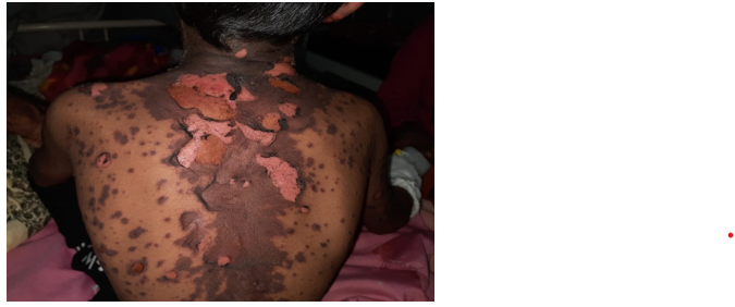 TEN is a rare but serious skin condition that causes widespread blistering and detachment of the skin. It is usually associated with medications and has an incidence of 0.4 to 1.2 million patient-years globally, with mortality rates ranging from 30% to 50%. To be diagnosed with TEN, a patient must have skin detachment of more than 30% of their total body surface area (excluding the buttocks). Hypersensitivity reactions to medications are the most common cause of TEN mentioned below: Some drugs carry a high risk of inducing TEN, and their use should be carefully evaluated and suspected promptly if symptoms appear. These drugs include Allopurinol, Carbamazepine, Cotrimoxazole (and other anti-infective sulfonamides and sulfasalazine), lamotrigine, Nevirapine, Non-steroidal Anti-inflammatory Drugs (NSAIDs) (oxicam type; e. g., meloxicam, para-aminophenol derivative e. g., acetaminophen), Phenobarbital, and Phenytoin. Drugs with a moderate risk for inducing TEN include Cephalosporin, macrolides, quinolones, tetracycline, and NSAIDs of the acetic acid type (such as diclofenac). Drugs without increased risk for TEN:-B-blockers, Angiotensin Converting Enzyme (ACE) inhibitors, Calcium channel blockers, Thiazide diuretics (with sulfonamide structure), Sulfonylurea Antidiabetics (with sulfonamide structure), Insulin, NSAIDs (propionic acid type; e. g., ibuprofen) etc. Apart from drugs, viral infections [cytomegalovirus, dengue] and mycoplasma pneumonia infection were also reported as potential causes [6-8]. Clinical manifestations of TEN: Initially, this disease may present as a fever, flu-like symptoms, and sore throat, making early diagnosis difficult. However, characteristic skin lesions typically appear next. These lesions are typically poorly defined and coalescing, with red macules that have purpuric or necrotic centers. The lesions may be accompanied by intense pain and erythema and typically begin on the face and thorax, spreading to other areas symmetrically while sparing the scalp, palms, and soles. As the disease progresses, vesicles and bullae may develop, and the skin may begin to slough. Two important clinical signs of TEN include the nikolsky sign, which is the dislodgement of intact superficial epidermis with gentle lateral pressure, indicating a cleavage plane at the dermo-epidermal junction, and the bulla spread sign, which is the lateral spread of bullae upon pressure application [4]. TEN can affect the mucous membranes in up to 90% of patients, resulting in erosions and crusts that can appear before or after skin lesions. The condition often affects the oral mucosa and vermilion border, causing painful haemorrhagic erosions with a greyish-white membrane. This can make it difficult for patients to open their mouth, leading to undernutrition and dehydration. Eye involvement is also common, occurring in 80% of cases and causing purulent conjunctivitis, corneal ulcers, anterior uveitis, or panophthalmitis. However, the eye manifestations usually recover completely. Females are more likely to experience urogenital lesions, such as vaginal ulcers and erosions, vulval bullae, or vaginal synechiae. The acute phase of TEN typically lasts for 8-12 days and is characterized by fever, epidermal sloughing, and large areas of denuded skin, mucosal erosions, and ulcers. This is usually followed by a phase of re-epithelialization and healing. Diagnosis of TEN is primarily based on clinical observation. Blood tests may reveal anaemia and lymphopenia, as well as reduced serum albumin, and elevated liver enzymes, urea, and creatinine, which can indicate impending multiorgan failure. Metabolic abnormalities such as dyselectrolytemia and elevated blood glucose levels are also common. Although serum markers such as soluble FasL, soluble Cluster of differentiation (CD)40L, High Mobility Group Box (HMGB)-1, granulysin, and Interleukin (IL)-15 have been studied, their usefulness in the diagnosis and management of TEN require further validation in larger studies [5, 13]. The patient in our case-1 exhibited similar symptoms, including widespread lesions and extensive detachment of the epidermis (more than 30%) as shown in the fig. number 1, 2, and 3. The timeline of events is detailed in the case report, and the suspected cause was determined to be Tab. Acetaminophen. Treatment at our hospital involved intravenous antibiotics (cephalosporin, vancomycin) and systemic steroids, with Tab. Acetaminophen being discontinued from the treatment regimen. Acetaminophen, also known as paracetamol, is commonly used in both prescription and over-the-counter medications to alleviate pain and reduce fever. It is available in single-ingredient and combination drug products. Acetaminophen may rarely cause serious skin reactions. Serious skin reactions can occur even if you have taken acetaminophen in the past without any problems. Acetaminophen is primarily metabolized in the liver through glucuronidation, sulfation, and a minor oxidation pathway. When acetaminophen is metabolized by Cytochrome P (CYP) isozymes, it produces a reactive metabolite called NAPQI [n-acetyl para-amino benzo quinone imine], which is detoxified by the glutathione pathway. At high doses, the sulfation pathway becomes saturated, leading to an increased amount of the drug being eliminated unchanged and oxidized to NAPQI. Excessive NAPQI can deplete GSH stores and cause protein adducts to form, primarily targeting mitochondrial proteins and ion channels, resulting in energy loss, ion misbalance, and cell death. Although toxic epidermal necrolysis is a rare adverse drug reaction caused by acetaminophen, it has been reported in 0.49% of cases. Meanwhile, the National Institute for Health and Care Excellence (NICE) guidelines for pediatric fever management do not recommend using antipyretic agents solely to reduce body temperature in children with fever [9-11, 15]. Despite ongoing investigation, the mechanism behind this reaction is not yet fully unders