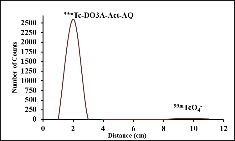 The radiolabeling efficiency of the 99mTc-DO3A-Act-AQ was measured using ascending instant thin layer chromatography (ITLC) on silica gel (SG) strips using 100% acetone as developing solvent and simultaneously in pyridine: acetic acid: water (PAW) (3: 5: 1.5). Each TLC was cut in equal segments of 0.5 cm and counts were measured in each segment using a gamma counter. Percentage of free Na 99mTcO4-, reduced/hydrolysed 99mTc and the radioconjugate formation was calculated by using this method where free 99mTc moved with the solvent front in acetone while 99mTc-DO3A-Act-AQ remained at the point of application on ITLC-SG. Whereas in PAW solvent system, technetium colloids remained at origin (base spot) and radioconjugate moved with the solvent. In similar manner, radiochemical purity of 99mTc-DO3A-Act-AQ was assessed utilizing ascending instant thin layer chromatography (ITLC-SG) in citrate buffer where the radiolabeled complex remained at the origin (point of application). The radiolabeled conjugate was purified using a C-18 reversed phase extraction cartridge (preconditioned with methanol and water (10 mL). The cartridge was sequentially washed with water and ethanol (5 mL each) and radiolabeled conjugate was eluted using 5% ethanol. The 99mTc–DO3A-Act-AQ was reconstituted in saline and filtered through a sterile 0.22 mm Millipore filter and radiotracer purity was monitored by ITLC.