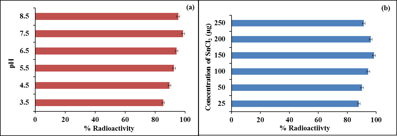 Fig. 2: Effect of (a) pH and (b) stannous chloride (SnCl2) concentration on the labeling efficiency of 99mTc-DO3A-Act-AQ