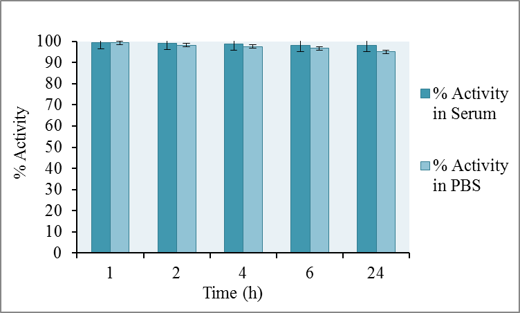 Human serum is extracted from healthy volunteer’s blood by clotting the blood for 50 min at 37 °C in a humidified incubator at 95% air / 5% CO2. The incubated samples were centrifuged at 400 rpm and serum was filtered through 0.22 µm syringe filter. 100 μL of 99mTc-DO3A-Act-AQ was incubated with 1 mL of human serum in test tube. The stability of the complex was determined at different time interval of 1, 2, 4, 6 and 24 h post incubation using ITLC with pyridine/ acetic acid/ water (3:5:1.5) as mobile phase. Percentage of free pertechnetate at each time point was estimated which indicates the percentage dissociation of the complex at that particular time point in serum.