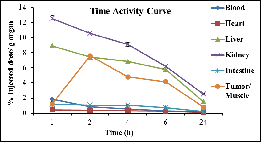 For the blood kinetics studies, 99mTc-DO3A-Act-AQ was intravenously administered in healthy rabbits. Briefly, 0.3 mL of 99mTc-DO3A-Act-AQ was administrated through the dorsal ear vein of the rabbit. The blood sample from the other ear vein was taken at different time intervals (0.25, 0.5, 1, 2, 4 and 24 h) and collected in heparinised tubes. The blood samples were accurately weighed to the second place of decimal in terms of g and number of counts was measured using gamma well counter. Data is expressed as percent administrated dose present in the whole body blood considering whole body blood as 7% of the body.