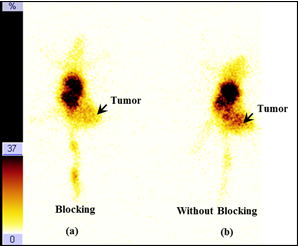 Fig. 6: Whole-body γ image of BMG-1 tumor xenografted athymic nude male mice at 2 h p. i with and without co-administration of blocking dose of DO3A-Act-AQ (200 µg)