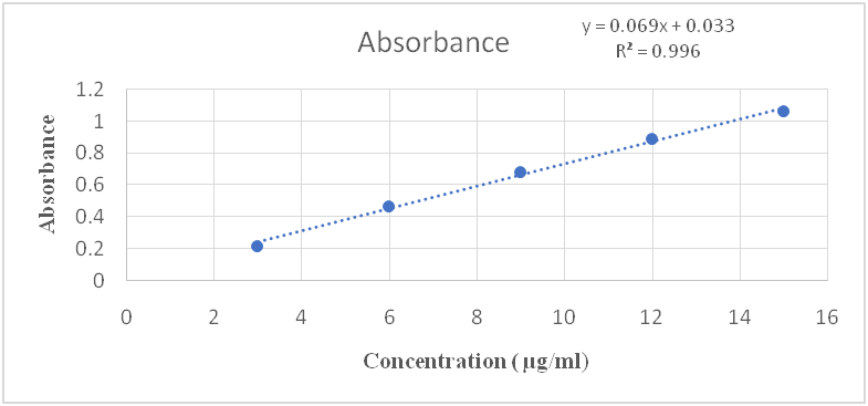 Linearity is defined as an ability of the analytical procedure to obtain test results which are directly proportional to the concentration of the analyte in the sample. Pipette out 0.3, 0.6, 0.9, 1.2, and 1.5 ml from the solution of 100 µg/ml and dilute to 10 ml with the methanol. Concentration is 3,6,9,12,15 µg/ml. Taking the absorbance at 272 nm and calculate regression coefficient for the range of (3-15 µg/ml) [9].