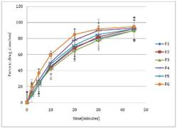 Drug dissolution processes were conducted for the six formulas prepared in the current study and the amount of drug dissolved in each sample was plotted against the time in minutes.