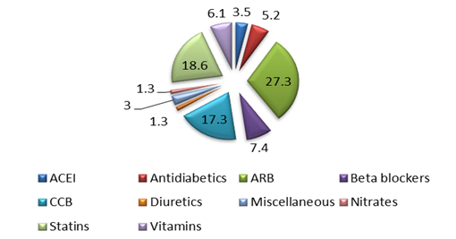 Among the drugs promoted, 47.1% were fixed dose combinations (FDCs) and the remaining were single drug preparations. Among the drugs promoted for cardiovascular diseases, angiotensin receptor blockers (ARBs) were the leading group with 30% of the literatures promoting them, followed by statins (20.5%) and calcium channel blockers (18.1%). Among the ARBs, telmisartan and olmesartan were seen in most of the literatures and among calcium channel blockers cilnidipine and amlodipine were the commonly promoted drugs. Diltiazem was seen in only one literature. Beta blockers were seen in 8.1% of the literatures. Metoprolol was the most commonly promoted beta blocker followed by nebivolol and carvediolol. ACE inhibitors were also less commonly promoted (3.8%) as well as diuretics in single drug combination (1.4%). Diuretics were most often promoted as FDCs with ARBs/CCBs/Beta blockers. Nitrates being seen in 1.5% of the literatures were also less commonly promoted drugs. Antiplatelets like aspirin, clopidogrel were promoted as FDCs with statins rather than as single drug preparations. Remaining literatures were promoting vitamins (mainly methylcobalamines & folic acid claiming to be effective for hyperchomocysteinemia), coenzyme Q containing preparations (claiming to be having free radical scavenging property), L-carnitine (claiming as metabolic cardioprotector in cardiomyopathy), anticoagulants (warfarin, tirofiban), antiplatelets etc. (fig 1)