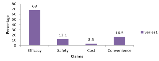 Claims were categorized as efficacy claims, safety claims, cost claims and convenience claims. Out of the total 231 claims seen in the promotional literature, maximum claims for efficacy (68%), followed by convenience claims (16.5%), safety claims (12.1%) and cost (3.5%) (fig 2).