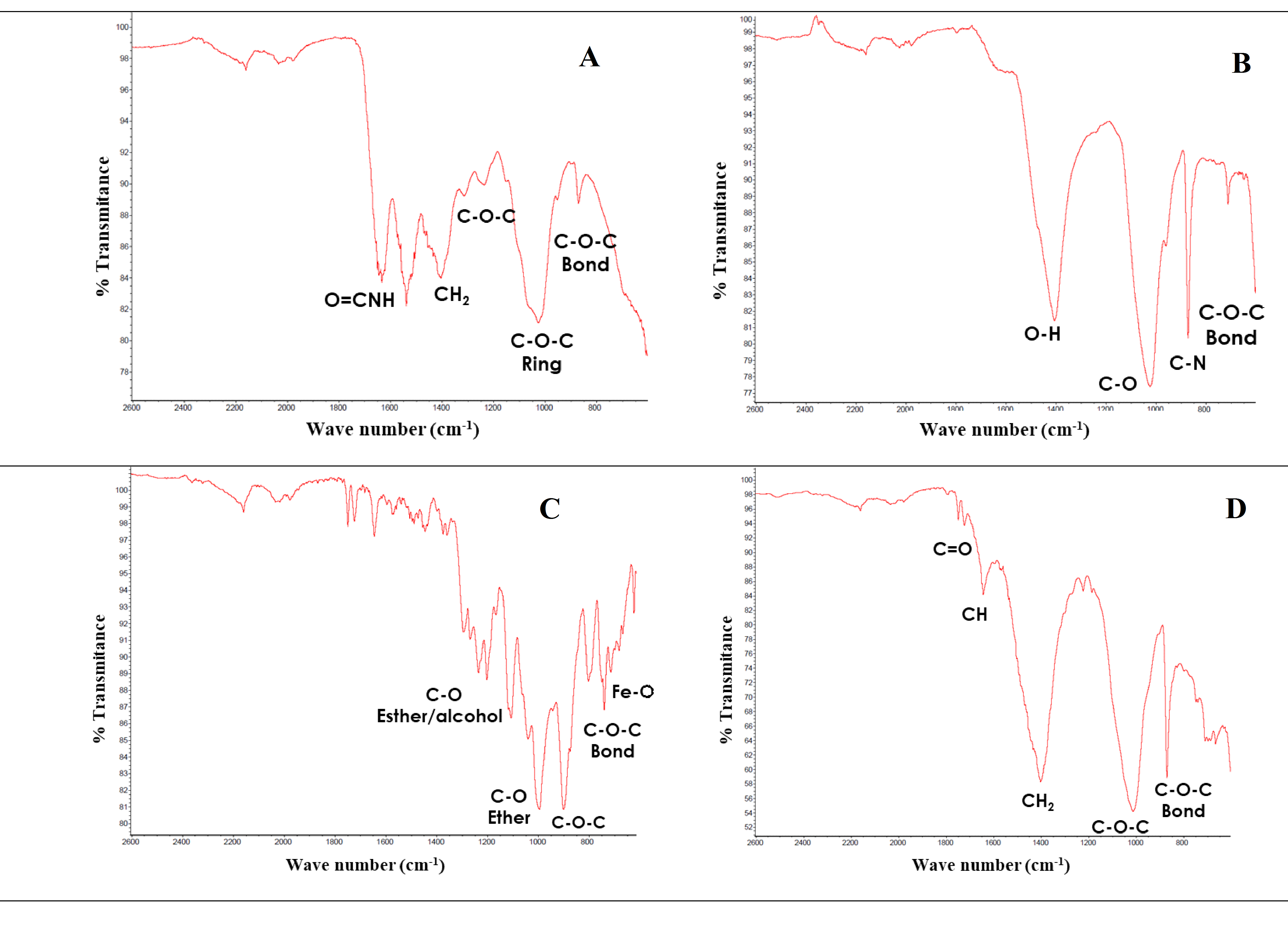 Fig. 1: FT-IR infrared spectra of different adsorbents. (A) Chitin-based substrate, CBS (B) urea-treated material, CA1:3U, (C) magnetite-treated material, CAM, (D) commercial activated carbon, CAC