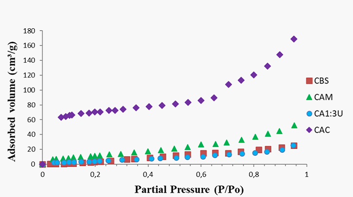 The N2 sorption isotherms are depicted in fig. 3. The adsorbed volume of nitrogen was much higher in the CAC followed by CAM, whereas the CBS and CA1:3U did not show significant differences.