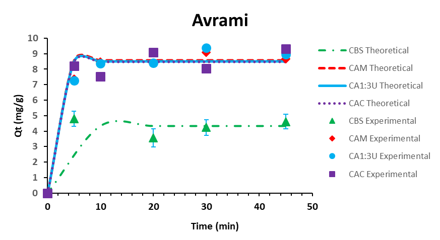 Likewise, the CBS and CAC materials presented the best fit to the Avrami model. In this case, the adsorption process might have a rapid initial fast first stage due to a mass transfer of adsorbate from the aqueous solution to the material surface followed by a slow phase where migration of the drug within the pores and capillary spaces of the sorbent took place. Independent of the model used, CBS presented the lowest Qe values, indicating that chemical modification improved the adsorption of AB. Further, a rapid AB was also observed, indicating in most cases that Qe was reached within 5 min. Further, the time-related constants such as “K” and “n” did not show major differences among all materials due to the rapid adsorption process.