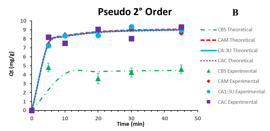Table 3 and fig. 4 show data fitting to the adsorption kinetics of AB. Functionalized materials such as CAM and CA1:3U showed the best fit to the pseudo-second-order model, which describes that the rate of occupation of the adsorption sites is related to the square of the number of unoccupied adsorption sites. This means a fast initial rate of k values of ~0.84 mg g-1 min-1, whereas reported values for nano adsorbents such as Ag-TiO2 showed values of 2.35 mg g-1 min-1, requiring longer treatment times [25]. Usually, materials having good fit to such kinetic model involve small and simple adsorbate species because they tend to diffuse rapidly in solution, adopting different molecular conformations within tiny pore spaces in fractions of seconds. In this case only such collisions that imply collisions with two unoccupied sites at once are taken into account, resulting in sticking [26]. It is possible that sticking takes place at individual sites composed of two or more functional groups at the surface of the adsorbents, such as Fe (III) and N.