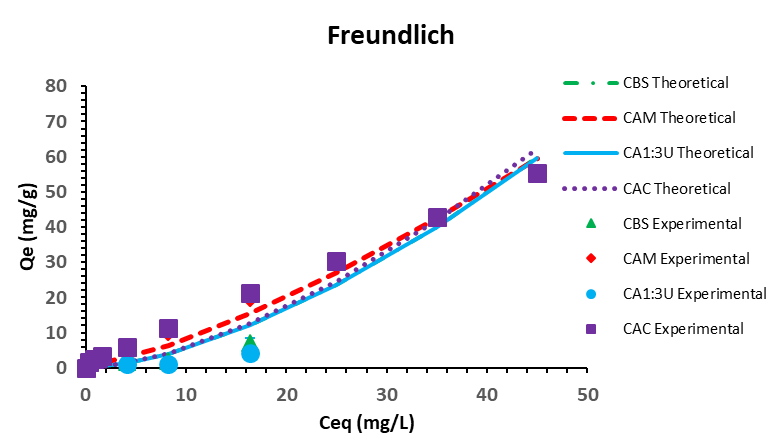 Where, Qe is the equilibrium adsorption, K (mg/g) and 1/n correspond to the adsorption capacity and the relative distribution of energy (heterogeneity) of the adsorbent sites. Thus, 1/n>1 indicates cooperative adsorption, 1/n<1 corresponds to a normal adsorption and 1<n<10 indicates a favorable adsorption process [17].