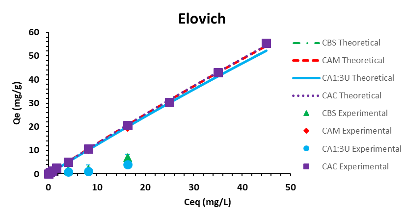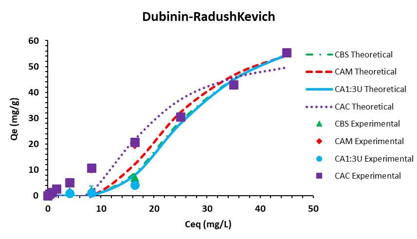 Table 5 and fig. 5 show the parameters resulted from the adsorption isotherms. CBS shows the best fit to the Freundlich model, which states that the adsorption sites on the surface of the adsorbent are energetically heterogeneous, with those with the highest energy being occupied first and the possible formation of multilayers. Similar studies conducted on carbon nanotubes and lipophilic drugs such as betamethasone showed “n” and “k” values of 0.7 and 5.1 mg g-1, respectively. This could be explained by the large surface area and hydrophobic character of the carbon nanotubes [27]. On the other hand, CAC and CAM presented a good fit to the Elovich model, which describes that the adsorption increases exponentially with the available multilayer adsorption sites [28]. CA1:3U presented the best data fit to the Dubinin-RadushKevich model, which also applies to heterogeneous surfaces.