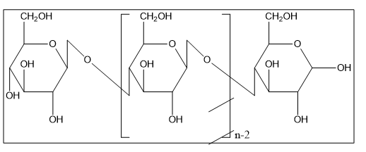 Cellulose is the linear polymer of anhydroglucose and one of the most abundantly occurring natural polymers on earth. Cellulose is one of the complex carbohydrates consisting of 3000 or more repeating glucose units. Fig.3 shows the structure of cellulose. It is the basic structural component of plant cell walls non-digestible by man. Cellulose is crystalline, and infusible because of its regular structure and array of hydroxyl groups, as well as it tends to form hydrogen-bonded crystalline microfibrils and fibres and is used in the form of paper or cardboard in the packaging context. Work on cellulose derivatives in 1993 was done and was found out that cellulose is swollen and dissolved using a solvent to films, coatings, or filaments. The swollen cellulose structure can be chemically modified to improve its properties [44].