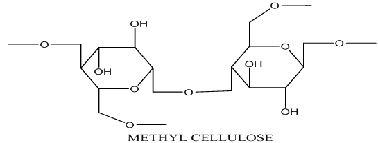 Methylcellulose (MC) is formed when one or several of the hydroxyl groups (-OH) in an anhydroglucose unit are replaced by a methoxide group (-OCH3). Fig.5 represents structure of methyl cellulose. If the other two hydroxyl groups in the sugar unit can be replaced by; ethyl (-OC2H5) or a hydroxypropyl (-OCH2CH(OH)CH3) group, the corresponding compound is called methylethylcellulose (MEC) or hydroxypropyl methylcellulose (HPMC).