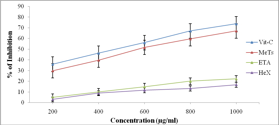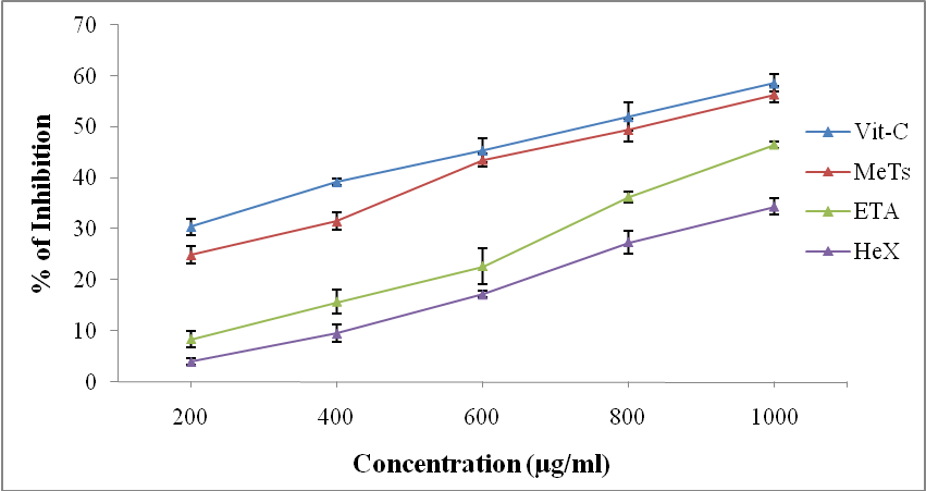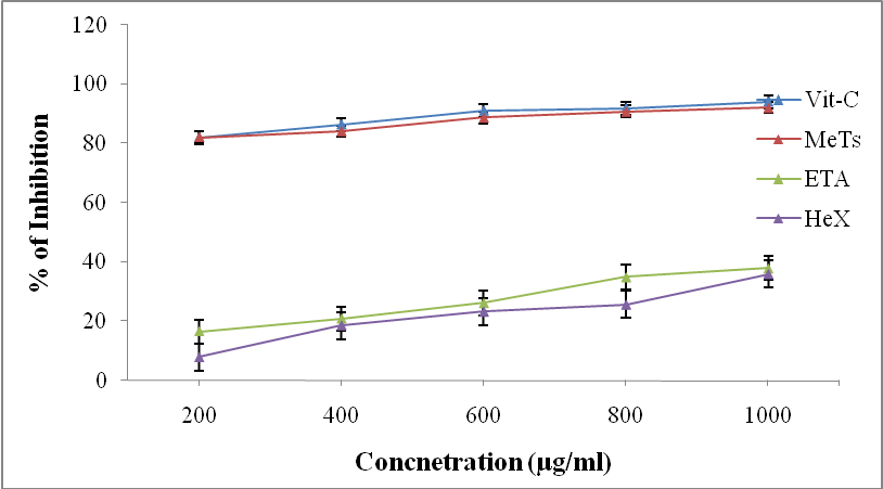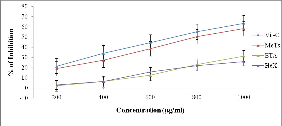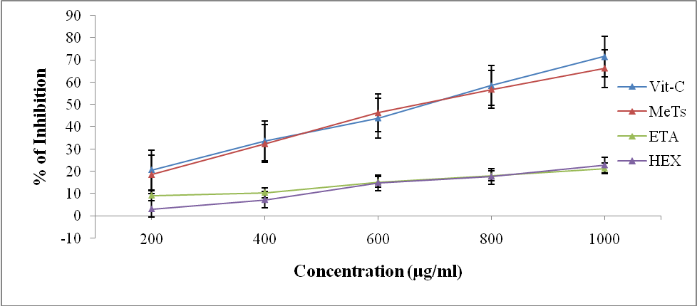 The superoxide anion derived from dissolved oxygen by phenazinemethosulphate/NADH coupling reaction reduces nitrobluetetrazolium. The decreased absorbance at 560 nm with plant extract indicates the consumption of superoxide anion in the reaction mixture. As mentioned in [fig. 4]. The MeTs as well as vitamin C showed the scavenging activity; IC50 values, 595.15±0.59 and 490.50±2.08µg/ml, respectively. But ETA and Hex extract showed no scavenging activity.