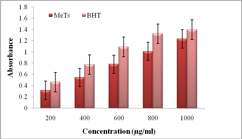 DPPH test is commonly used as substrate to evaluate antioxidative activity of antioxidants[19]. The evaluation is based on the reduction of alcoholic DPPH solution in the presence of hydrogen donating antioxidant from the extract by which the formation of the non-radical form DPPH-H [21]. MeTs has the ability to reduce the stable radical DPPH to the yellow-coloured diphenylpicrylhydrazine. The hydroxyl radical is an extremely reactive free radical formed in biological systems and has been implicated as a highly damaging species in free radical pathology, capable of damaging almost every molecule found in living cells [22].