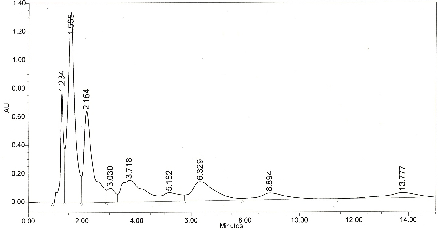 HPLC profile of aqueous extract of hirda fruit after gel chromatography was developed using analytical HPLC (Waters) with UV detector at 280 nm. The stationary phase was X Bridge C18 column and the mobile phase was acetonitrile and water (5: 95) containing 0.1 % TFA. Flow rate was maintained at 1.5 ml/min.