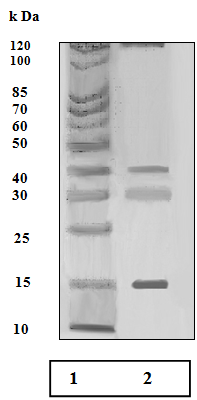 Fig. 1b: SDS-PAGE of crude aqueous extract of T. chebula fruit; Lane No. 1: Standard molecular markers (6-205 kDa) Lane No. 2: Aqueous extract of T. chebula