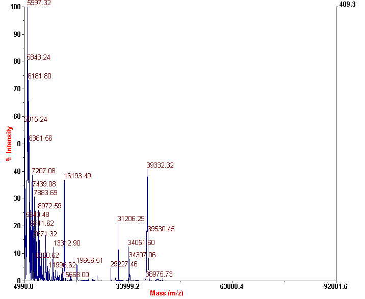 Mass spectral analysis was performed on a Voyager-De-STR (Applied Biosystems) MALDI-TOF. A nitrogen laser (337 nm) was used for desorption and ionization. A spectrum was acquired in the range of 10 to 100 kDa, in linear mode with delayed ion extraction and with an accelerating voltage of 25 kV. The low mass ion gate was set at 4500 Da. All the analyses were performed in four replications. The instrument was calibrated with myoglobulin and bovine serum albumin.