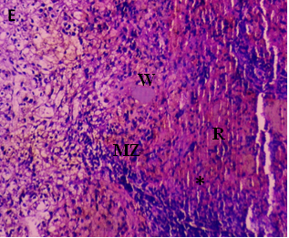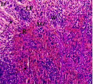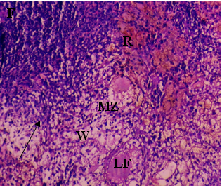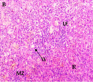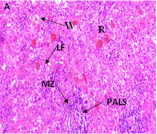 The current investigation focused on spleen histopathology to examine the overall condition of the organ. Elmore (2006), R. E. Mebius and G. Kraal (2005), as well as other sources, were used to anatomize the histopathological differences shown in fig. 114,15. Fig. 1 shows normal histoarchitecture in the control spleen tissue of a male albino rat, with sufficient amounts of red pulp (R), white pulp (W), lymphoid follicles (LF), and marginal zone (MZ). Table 2 has detailed histology observations. The histological structures in the cyphenothrin-treated group were well terminated, just like in the control group. The red pulp in the group that received high doses of the pesticide cyphenothrin showed decreased cellularity, while the white pulp was severely destroyed, with no normal lymphoid follicle and boundary zone. White pulp and red pulp from the low-cure cyphenothrin group showed destroyed cellular integrity. This cyphenothrin-treated group, which included high and low doses, demonstrated notable modifications of histological structures in contrast. In comparison to the cyphenothrin high dosage group, the white pulp recovered effectively in the cyphenothrin insecticide low dose treatment group.