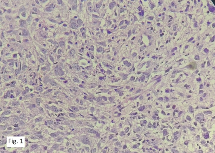 Fig. 1: H and E stained microsection revealing oval to spindle shaped pleomorphic tumour cells (400X)