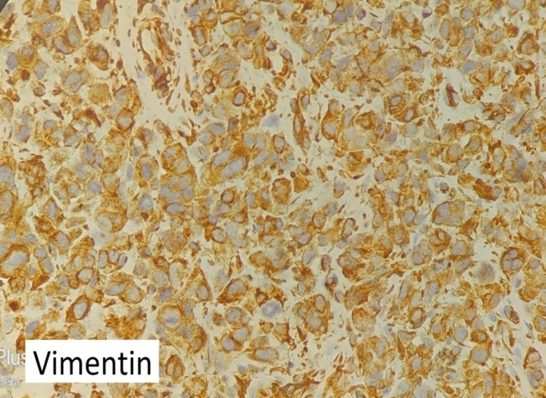 Fig. 2b: On Immunohistochemical staining (IHC), tumor cells revealing strong positivity for vimentin (400X)
