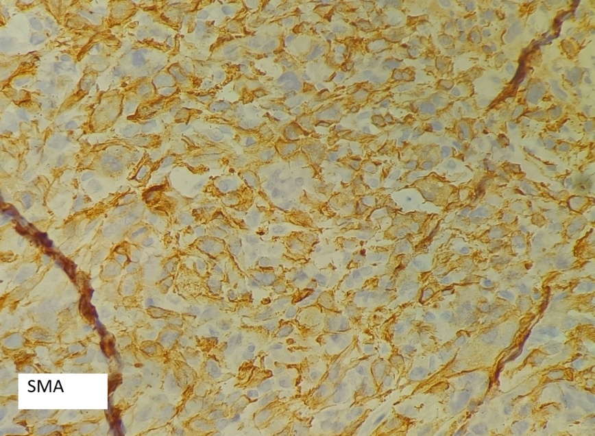 Tumour cells were positive for Vimentin and Smooth muscle actin (SMA) with Ki67~ 70%. CK, LCA and S100 were found negative.
