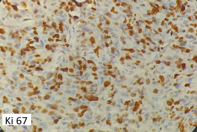 Fig. 2d: Immunohistochemical staining (IHC) for Ki67-showing 70% positivity in tumor cells (400X)