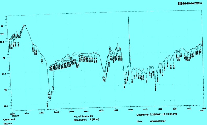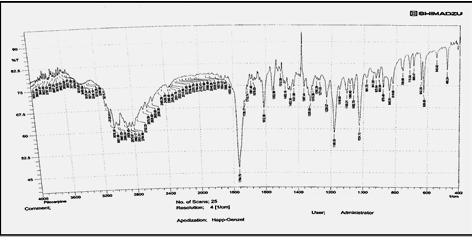 FTIR spectra of the pure drug were obtained using FTIR spectrometer (FTIR-8400S spectrophotometer, Shimadzu, Japan). Sample were ground thoroughly with KBr powder in mortar and pestle, in a weight ratio of 1:100 and then pressed the mixture in dies set in pellet press under a hydraulic pressure of 15 tons for a minute. Release the pressure by rotating the side valve in anticlockwise direction to take of the pellet from the dies set. Then, the pellet was placed in the sample holder and spectral scanning was taken in the wavelength region between 4000 and 400 cm-1 at a resolution of 4 cm-1 and scan speed of 2 mm/sec [16].