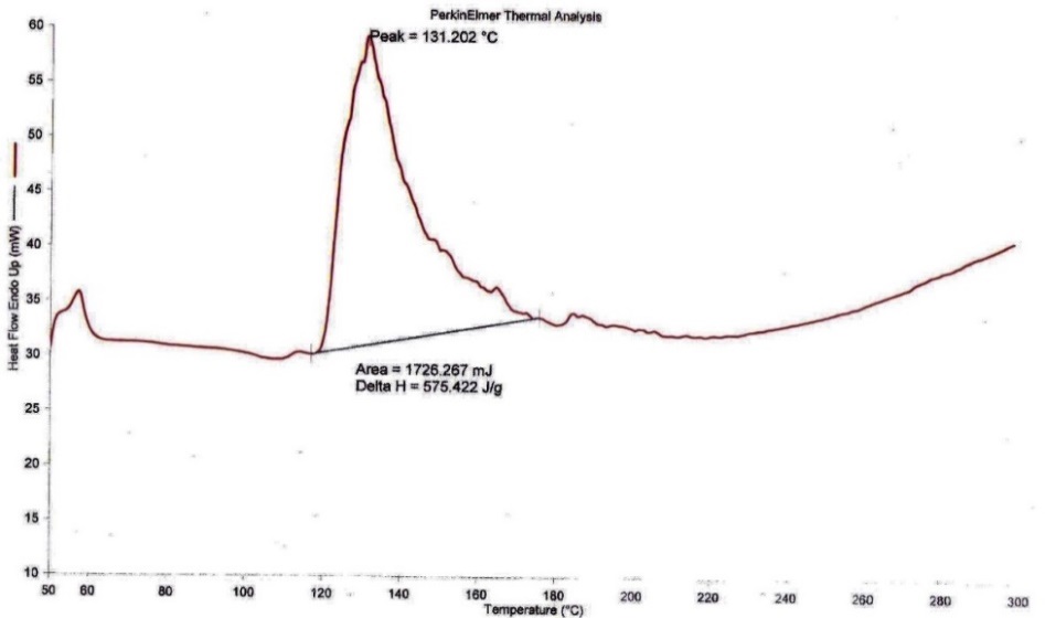 DSC analysis was performed on the pure drug by using Perkin-Elmer instrument (Pyris-1, Osaka, Japan), available at Department of Textile Technology, Indian Institute of Technology, New Delhi, India. Initially, the moisture was removed by heating the samples and then, each sample (about 3-7 mg) was accurately weighed into platinum crucible 40 μl aluminum pan in hermetically sealed condition, where alpha alumina powder used as a reference. Thermograms were recorded from 50 °C to 300 °C at the heating rate of 20 °C/min under a constant flow of an inert nitrogen gas atmosphere with the flow rate of 20 ml/min [18]. The DSC spectra used to find out the exotherm peak position or any change in their position compared with the standard spectra.