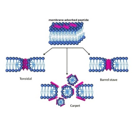 Antimicrobial peptides have been termed “natural antibiotics” due to broad spectrum activity against micro-organisms [8]. Cationic peptides interact directly with the negatively charged cellular membrane of bacteria cells resulting in enhanced membrane permeability and ultimately leading to swift cell lysis. [29]. So in effect the peptide can cause membrane disruption or membrane interaction, which may lead to the formation of transient pores and transport of the peptide into the cell thereby ensuring contact with the intracellular targets [30]. The four commonly used models to describe the mechanism of AMP action include: toroidal, carpet-like, barrel-stave and aggregate channel models.