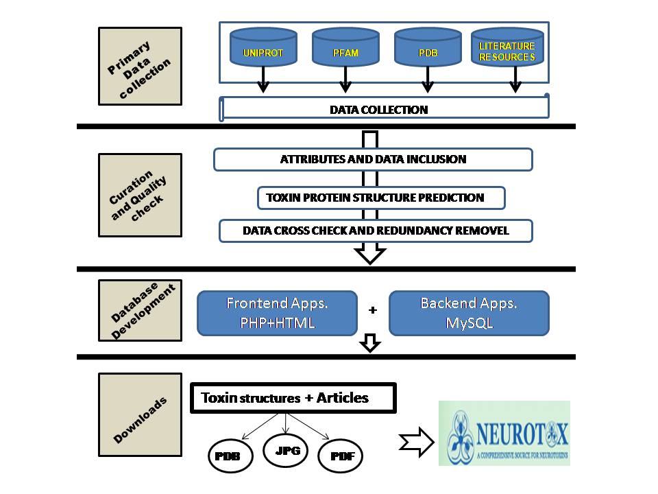 All neurotoxin data were collected from various resources, redundant data are removed and further cross checked thoroughly to ensure the quality of each data that is included in the database. The major repositories used for data collection are Uniprot, Pfam, Protein data bank (PDB). The primary data such as sequence and structure are retrieved from Swissprot and PDB. Other data such as literature are collected from PubMed resource and other publicly available open access literature resources. Prior to database development all important attributes are set for trouble-free way of sorting the collected data. Appropriate care has been given to have an error free data reserve. Each entry has been manually inspected before incorporating into the data base. The schematic overview and the data flow of the database are represented in fig.1.