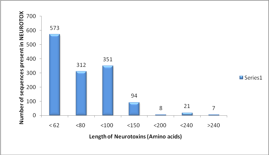 This database is populated with large sets of data, including 1400 toxin entries from 248 different species which includes 80 species of snakes, 56 species of scorpions, 46 species of spider, 36 species of venomous snails, 22 species of sea anemones, 5 species of ferocious and venomous honeybees, 2 species of lizard and 1 species of wasp. The distribution of neurotoxins across various source organisms that are covered in this database is shown in fig. 2. The entire data are arranged as relational database management system with MySQL. The sequential, functional description, source organism, Fasta formatted protein sequence, structures (if found), structural homologs obtained from similarity search for every toxin, molecular weight, protein family classification and supporting literature data obtained from PubMed database (http: //www. ncbi. nlm. nih. gov/pubmed/)are also included in this database. In addition to these fields, users can directly access the primary databases like NCBI, Uniprot, Pfam, PDB through the links provided in the NEUROTOX database. The sequence length distribution is shown in fig. 3.