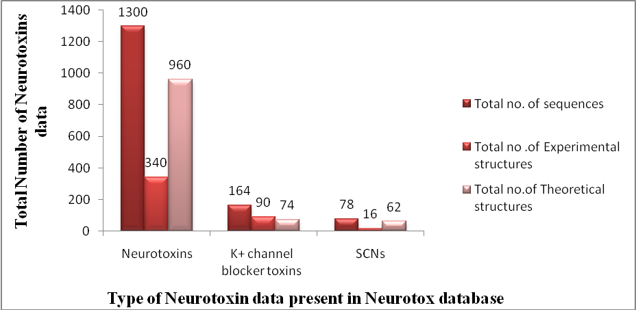 For instance, the modeled structures of toxins (K+channel blocker toxins and short chain neurotoxins) and their 3D coordinates are available in NEUROTOX. The structures were modeled through computational homology modeling using Modeller version 9v7. In addition to these all modeled proteins are easily downloadable in. PDB (RCSB) format and all the structures have been validated using PROCHECK and resulting Ramachandran plots are also available in downloadable form. Along with structures, some of the useful open access research articles are collected and included in this database which will be useful to the neurotoxin research community. NEUROTOX provides information of neurotoxin along with predicted structures of neurotoxins (1086 computationally resolved neurotoxin structures). An overview of the total numbers of structures, both experimentally determined and computationally derived, which are available in the database, is given in fig. 4. In addition it also provides full text research articles relevant to neurotoxin research which will provide a comprehensive data of neurotoxins.