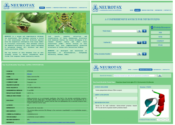 Methods: Here we present NEUROTOX, a database which contains more than 1400 toxin entries originating from more than ~248 different species. The data was enriched with the related data derived from various other protein sequence as well as structural databases and several literature resources. Each entry of toxin contains 18 fields providing detailed information on neurotoxins and their source, fasta formatted protein sequences, molecular weight, toxicity information along with their literature references.