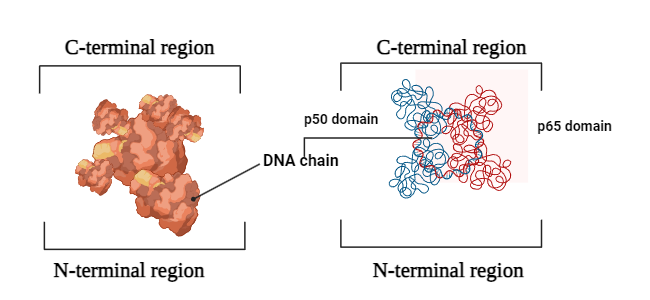 Fig. 2: Structure of NF-κB: NF-κB, typically formed as a P50-P65 dimer, acts as a transcription factor. Its N-terminal regions make specific DNA contacts, while C-terminal regions facilitate dimerization and stabilize DNA binding, resembling a molecular vise for precise gene regulation. This versatile molecule orchestrates diverse cellular responses in reaction to various stimuli [10]