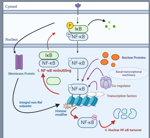 Fig. 4: The regulation of NF-κB within the nucleus is a highly sophisticated process; once NF-κB gains access to the nucleus, its transcriptional activity undergoes meticulous control by various nuclear regulators, represented in blue. These regulators include non-Rel subunits like RPS3 (S3) found within the NF-κB complex, proteins originally localized in the nucleus or trans-located from the cell membrane, as well as other transcription factors and chromatin modifiers, all of which play essential roles in regulating function off NF-κB. There are two distinct mechanisms, highlighted in red, that are employed to terminate the transactivation of NF-κB. The first pathway involves IκB-mediated relocation, which returns NF-κB to the cytoplasm. The second mechanism relies on ubiquitination-dependent nuclear degradation to effectively put an end to nuclear activity of NF-κB [34]