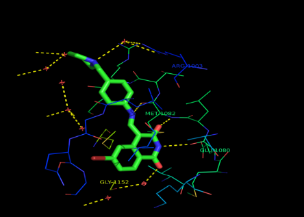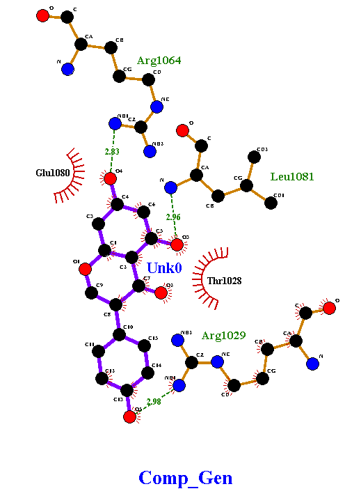 From Table3 it is clear that the active site residues GLU1080, GLU1027, GLU1025, GLU1145, MET1028, ARG1003, ARG1064, ARG1029, LYS 1150, LEU 1081 and THR1028in the receptor cavityplay an important role in drug binding and interaction.