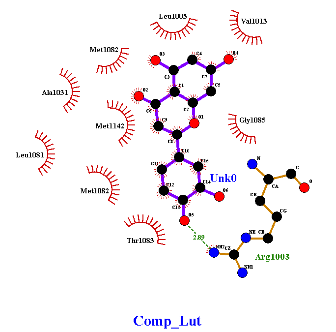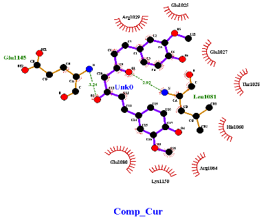 The Ligplot study revealed that among the selected ligands (fig. 5), Apigenin had 7 hydrophobic and 4 hydrogen bond interactions, which is the highest in comparison with the number of interactions as compared to the rest of the molecules (table 3). Curcumin had 8 hydrophobic and 2 hydrogen bonds followed by Leutolin with 9 hydrophobic and 1 hydrogen bond. Silibinin had 5 hydrophobic and 2 hydrogen bonds.