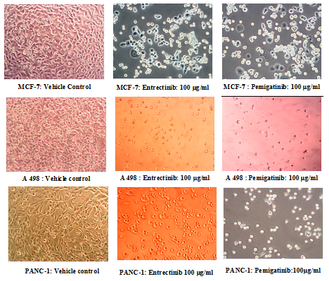 To verify whether the Pemigatinib and Entrectinib NSs were pharmacologically active, in vitro cytotoxicity tests were conducted on A498, MCF-7 and PANC-1 cell lines by MTT assay. The test Pemigatinib and Entrectinib NS formulations were screened against Morphology of A498, MCF-7 and PANC-1 cell lines. The images of the cell lines treated with vehicle control, Pemigatinib NS (100 µg/ml), and Entrectinib NS (100 µg/ml) were depicted in fig. 1. The result of the screening of drug-loaded NS against morphology of A498, MCF-7 and PANC-1 cell lines shows that the NSs have shown significant cytotoxic effect, these were found effective and there was a prominent inhibition of the cancer cell proliferation [27].
