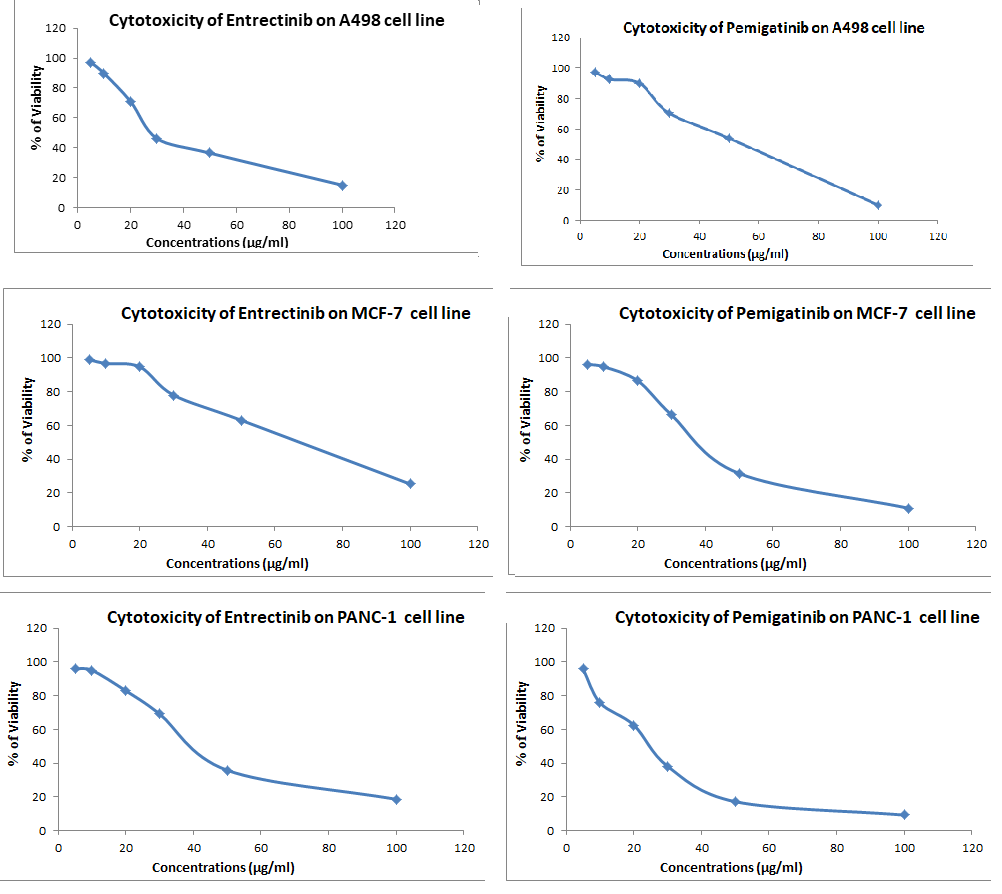 Results: The optimized formulation was evaluated for physical parameters and in vitro drug release study, the results were satisfactory. The IC50 of Entrectinib NS, Pemigatinib NS and 5-Fluorouracil, against A498 cell line was 26.34, 85.24 and 15.24 µg/ml, respectively. The IC50 of Entrectinib NS, Pemigatinib NS and 5-Fluorouracil, against MCF-7 cell line was 71.54, 35.48 and 24.56 µg/ml, respectively. The IC50 of Entrectinib NS, Pemigatinib NS and 5-Fluorouracil, against PANC-1 cell line was 35.14, 22.54 and 22.54 µg/ml, respectively. It was observed that the IC50 of drug-loaded NS was higher than the comparator drug and these enter the cells by active transport and induce cytotoxicity to the cells.