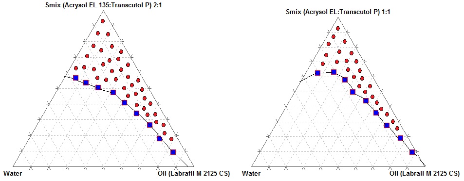 On the basis of solubility and emulsification study Labrafil®M 2125 CS, Acrysol®EL 135 and Carbitol® were selected as oil, surfactant and co-surfactant, respectively. To determine the concentration of components in the existing range of the nanoemulsion, a pseudo-ternary phase diagram was constructed using an aqueous titration method at ambient temperature (25°C). The surfactant and co-surfactant were mixed in different volume ratios (1:1, 1:2, 1:3, 1:4, 4:1, 3:1 and 2:1). Oil and surfactant / co-surfactant (Smix) were mixed thoroughly in different volume ratios (1:9, 2:8, 3:7, 4:6, 5:5, 6:4, 7:3, 8:2 and 9:1) and titrated with water by drop wise addition under gentle agitation. Slow titration with aqueous phase was done to each weight ratio of oil and Smix and visual observation was carried out for transparent and easily flowable o/w nanoemulsions. The proper ratio of one excipient to another in the nanoemulsion formulation was analyzed and the pseudo-ternary plot was constructed using TRIPLOT V14 software (version 4.1.0.2). All studies were repeated three times, with similar observations being made between repeats.
