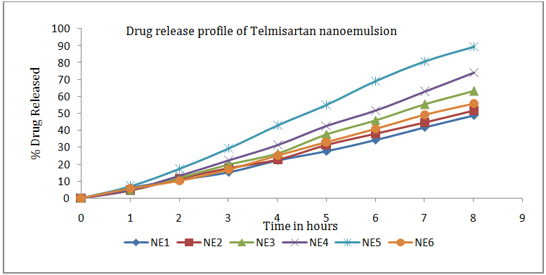 In vitro studies were performed to compare the release rate of the drug from the various nanoemulsion formulations all having the same quantity of Telmisartan (20 mg). The release rate of NE5 (89.57%) was found to be the best as compared to NE4 (74%) and other formulations.