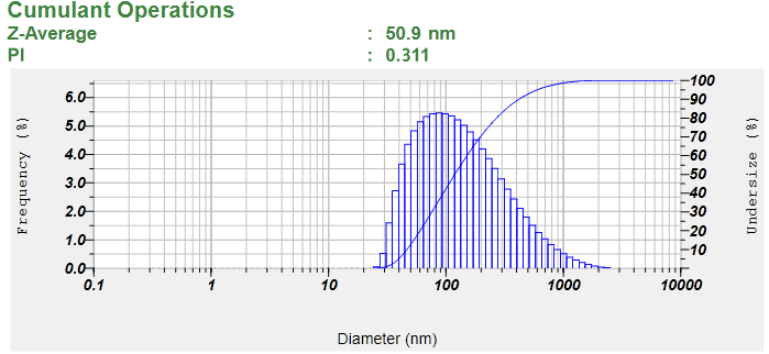 50 mg of the optimized nanoemulsion formulation was diluted with water to 100 ml in a flask, and gently mixed by hand. The droplet size distribution and zeta potential of the resultant emulsion was determined by laser diffraction analysis using a particle size analyzer (Horiba Scientific nanopartica, UK), that analyzes the fluctuations in light scattering due to Brownian motion of the particles. Light scattering was monitored at 25°C at a 90° angle.