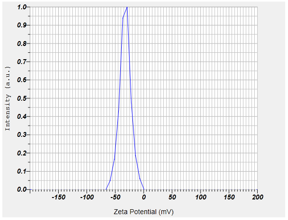 (-32.5 mV±0.56 mV, mean±SD, n=3) which indicates that the particles of nanoemulsions are negatively charged and are stable as shown in fig. 5. The particles are in a de-flocculated and shall repel each other and impart physical stability to the system.