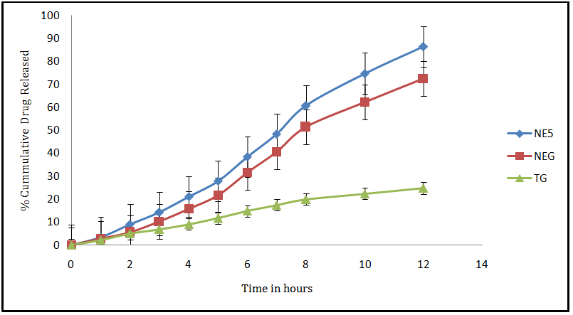 Ex-vivo skin permeation studies were performed to compare the release rate of the drug from the various nanoemulsion formulations (Telmisartan gel TG, NE5 and NEG) all having the same quantity of Telmisartan (20 mg). The release rate of NE5 (86.22%) was found to be more as compared to NEG (72.35%) and TG (12.31%) as shown in fig. 9. Here it was observed that the release of NE5 is slightly more than NEG because the gel formulation provides a higher diffusional resistance for drug release. The comparison between NE5, NEG and TG showed that even though the release rate of NEG was less than NE5, it was significantly more than that of TG, due to presence of the drug nanocarriers.