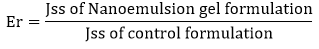 The pH of 1% aqueous solutions of the prepared nanoemulsion gel was found to be (6.93± 0.18, mean±SD, n = 3) at 25°C±1°C. Hence the preparation is non irritating to the skin.