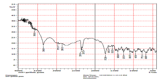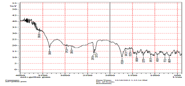 Fourier transform infrared (FTIR) spectra were taken on FTIR (model-200, Thermo Electron, Shimadzu) to investigate any possible chemical reactions between the drug and the polymer. FTIR spectra of the pure drug and physical mixture of drug with polymers were obtained. Pure drug (Zolmitriptan) and polymers were subjected to FTIR studies alone and in Combinations.(1:1) The mixtures were placed in the sample holder and were analyzed by FTIR to study the interference of polymers with the drug.(fig. 2 and 3).