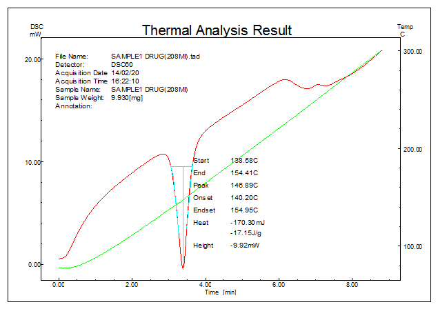 Differential scanning calorimetry (DSC) was used to evaluate the thermal behaviour of pure drug and physical mixture of the drug and excipients using a DSC-60 (Shimadzu Corporation, Japan.). Samples were weighed and sealed in standard aluminium pans and then scanned over a temperature range from 50 to 300C at a heating rate of 10.00 0C / min. (fig. 4, 5).